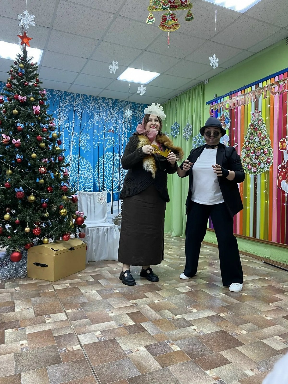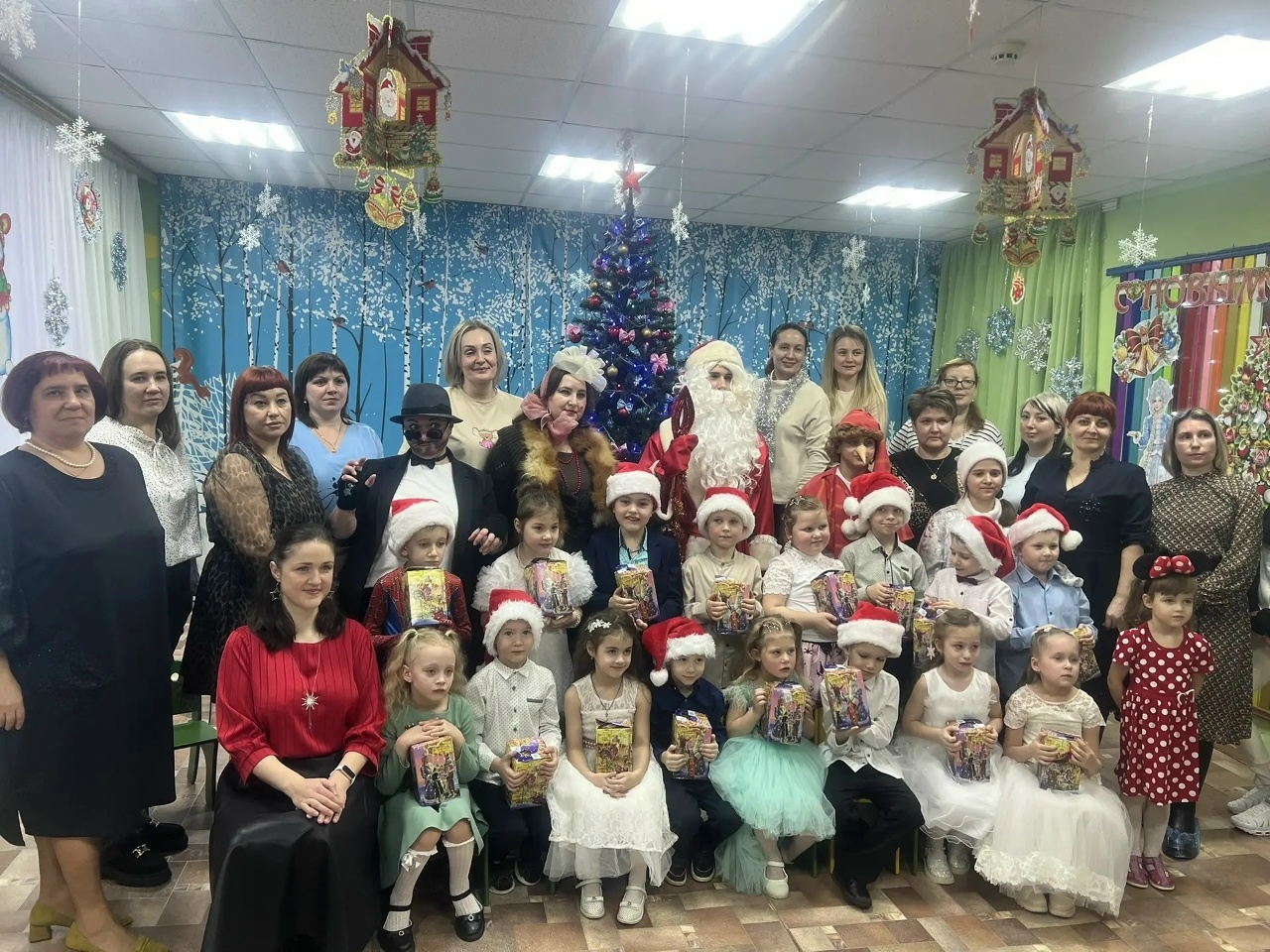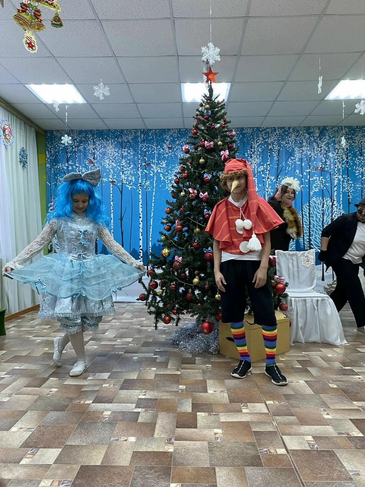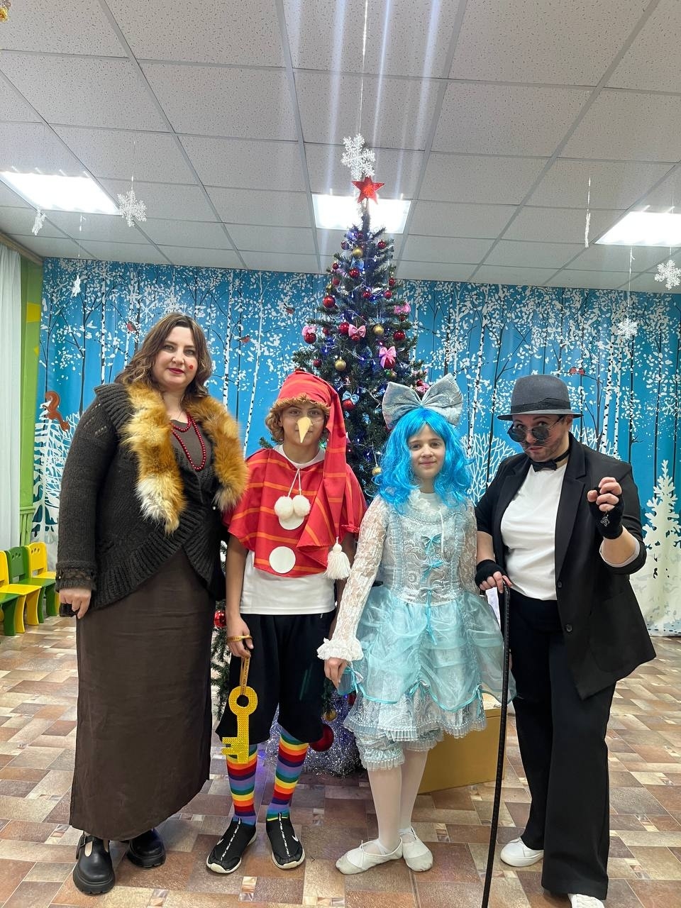 Новогодний утренник посетили лиса Алиса и кот Базилио, Буратино и Мальвина , Дед Мороз со Снегурочкой.