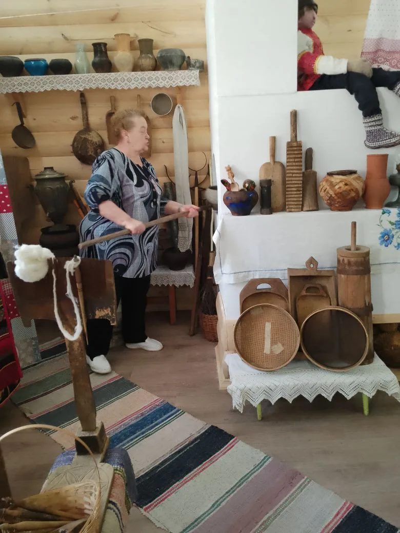 Ребят приветливо встретила руководитель экспозиции Соколова Вера Борисовна. Она погрузила гостей в эпоху прошлого, в этом ей помогли: деревянные стены, печь, лавки и коллекция предметов домашнего обихода.